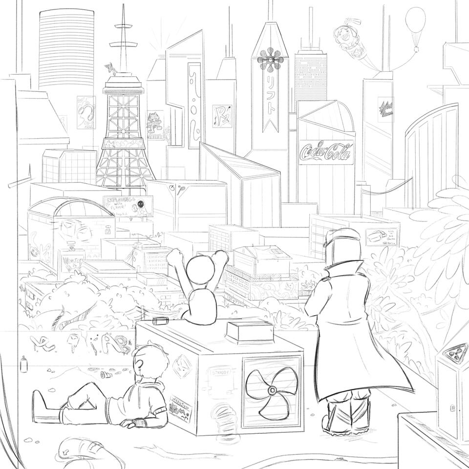 The city itself was inspired by other VR works such as Beat Saber and the variety of art found in VRChat and was meant to reflect elements of both music and VR technology. I've been working on this world since June of 2024 and plan to eventually develop some sort of animated project with it. Much of the worldbuilding has involved exploring common themes of cyberpunk and figuring out how to put a more colorful twist to it that can then also lean into the genre of solarpunk- a more eco-friendly counterpart. A common characteristic of the cyberpunk genre is having dark (both literally and figuratively) themes, yet I wanted to add more cartoony characteristics.